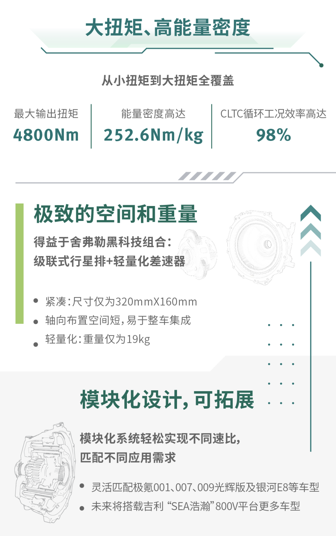 2023年底,舍弗勒面向大扭矩應用的高性能同軸減速箱在太倉制造基地投產。4800Nm的最大輸出扭矩,252.6Nm/kg的能量密度,98%的CLTC循環工況效率,讓這款產品成為舍弗勒在電氣化領域的又一金字招牌。在設計上,這款產品順應各大主機廠的產品布局方向,主要瞄準800V高壓平臺應用,提升補能效率。得益于舍弗勒在電驅動領域豐富的設計和應用經驗,這款產品在空間、重量和性能等方面具有顯著優勢。