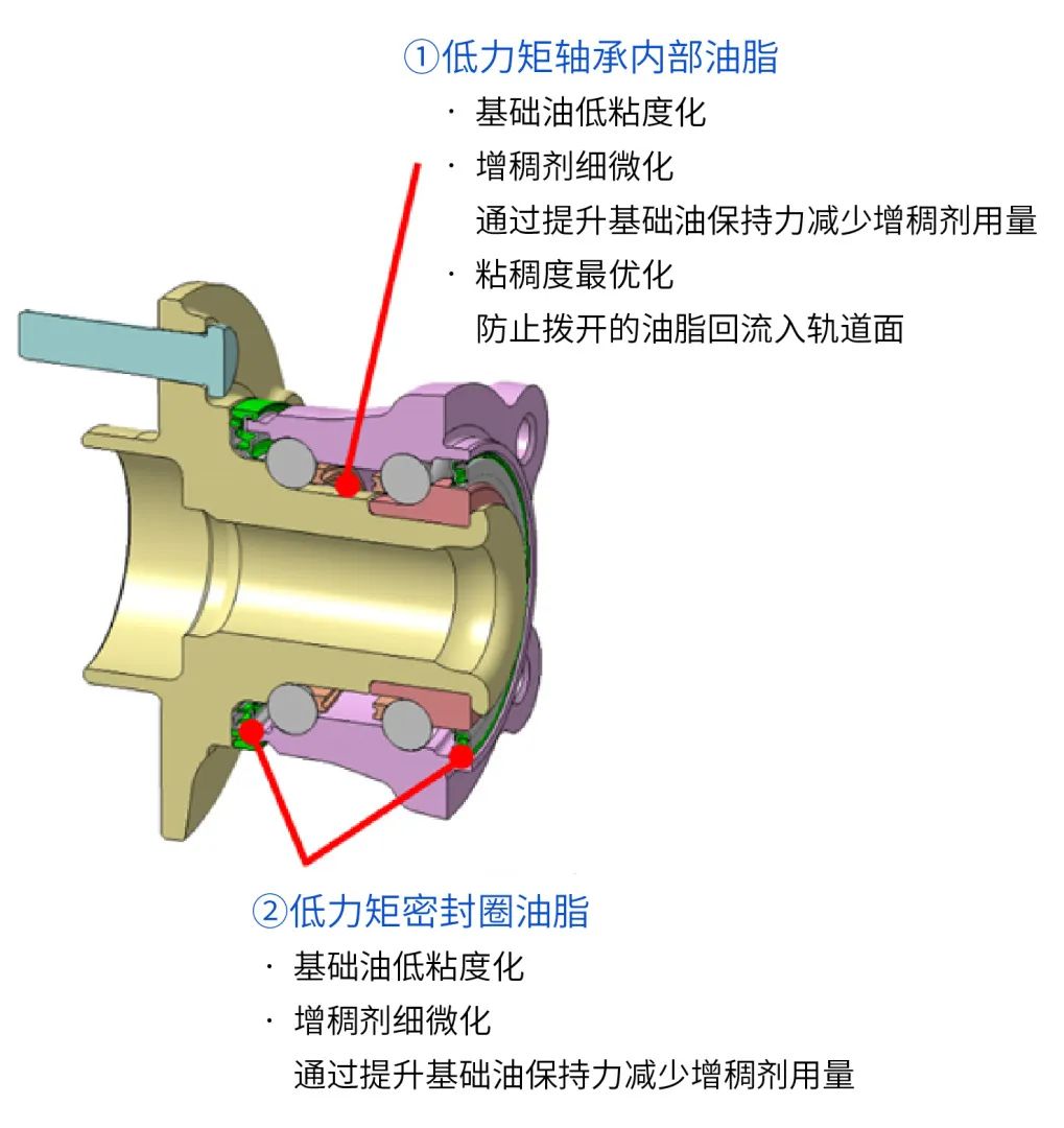 通過增稠劑尺寸的微細(xì)化,在不降低基礎(chǔ)油的保持力的情況下成功地削減了增稠劑量,進(jìn)一步實現(xiàn)了潤滑脂的低粘度化。這些改進(jìn)減少了密封圈旋轉(zhuǎn)時由油脂引起的阻力,并降低了行駛時的旋轉(zhuǎn)摩擦力矩。